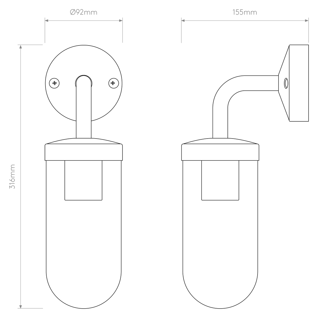 - IP & Safety Rating: IP44 — suitable for exterior and bathroom wall mounting. Class I (earthed). Can be mounted on flammable surfaces.