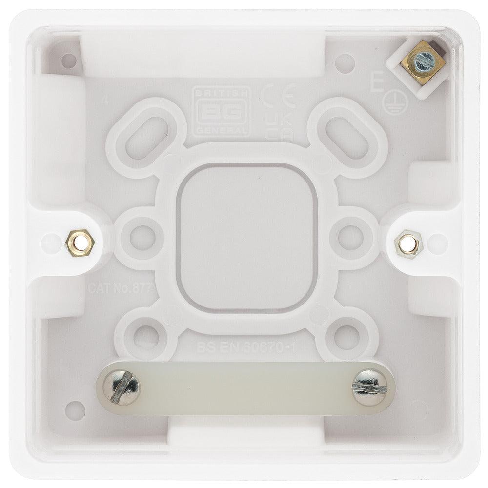 • The British General Nexus 800 series white moulded 50mm deep surface mounting box simplifies single power point installations requiring extra depth, without the need for wall material removal.