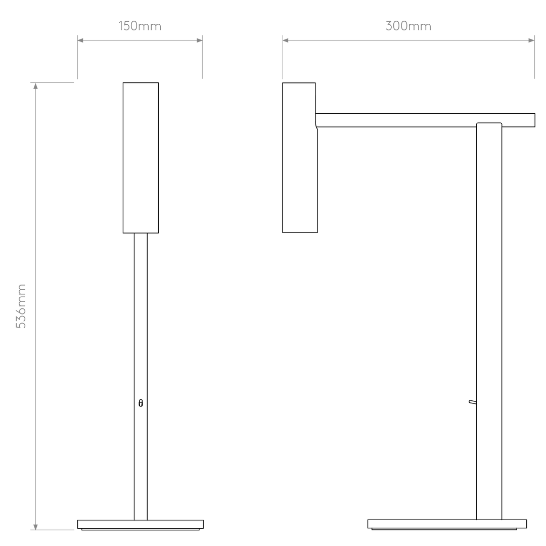 - Dimensions: Height: 499–555 mm (adjustable); Width: 150 mm; Maximum Reach: 355 mm; Shade: Ø 42 mm × L 180 mm; Weight: ~3.6 kg