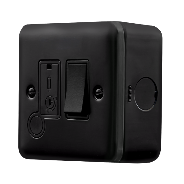 The Scolmore MCP051 is a 13A Double Pole Switched Fused Connection Unit with an optional front-mounted flex outlet and red LED indicator, part of the Metal Clad Pro range. Engineered for durability and safety, it features a robust electrophoretically coated steel construction and is suitable for both residential and commercial applications. Available in Black, Polar White, and Metal Clad finishes to complement various environments.